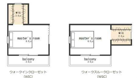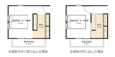 如上圖左就是一個“步入式”的空間,而右圖則是將其作為進(jìn)入臥室的前室來處理,兩者的差別就在于是否貫穿。早晨起床后能夠在穿過衣帽間的過程中拿取衣物,相對第一種模式來說能夠大大縮短早上找衣服的時間。但是這種貫穿的模式需要增加衣帽間的通道。