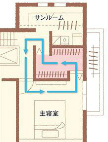 衣帽間的出入口在主寢室和走廊各設(shè)置一個,形成貫穿式,并且,“洗衣”“干衣”“折疊”“熨燙”的家務(wù)空間集成在北邊的家務(wù)間里,更方便了這一系列的家務(wù)動線。