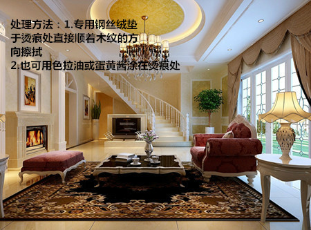 處理方法:用一塊干燥的、超細(xì)的家具涂裝專用鋼絲絨墊于燙痕處直接順著木紋的方向擦拭,也可用色拉油或蛋黃醬涂在燙痕處,取軟布順木紋輕輕擦拭,然后再換一塊清潔的軟布將其擦干凈,后上光。煙頭或未熄滅的火柴在家具漆面留下焦痕,若是漆面燒灼,可在火柴桿或牙簽上包一層細(xì)紋硬布,輕輕擦抹痕跡,然后涂上一層薄蠟,焦痕即可淡化。