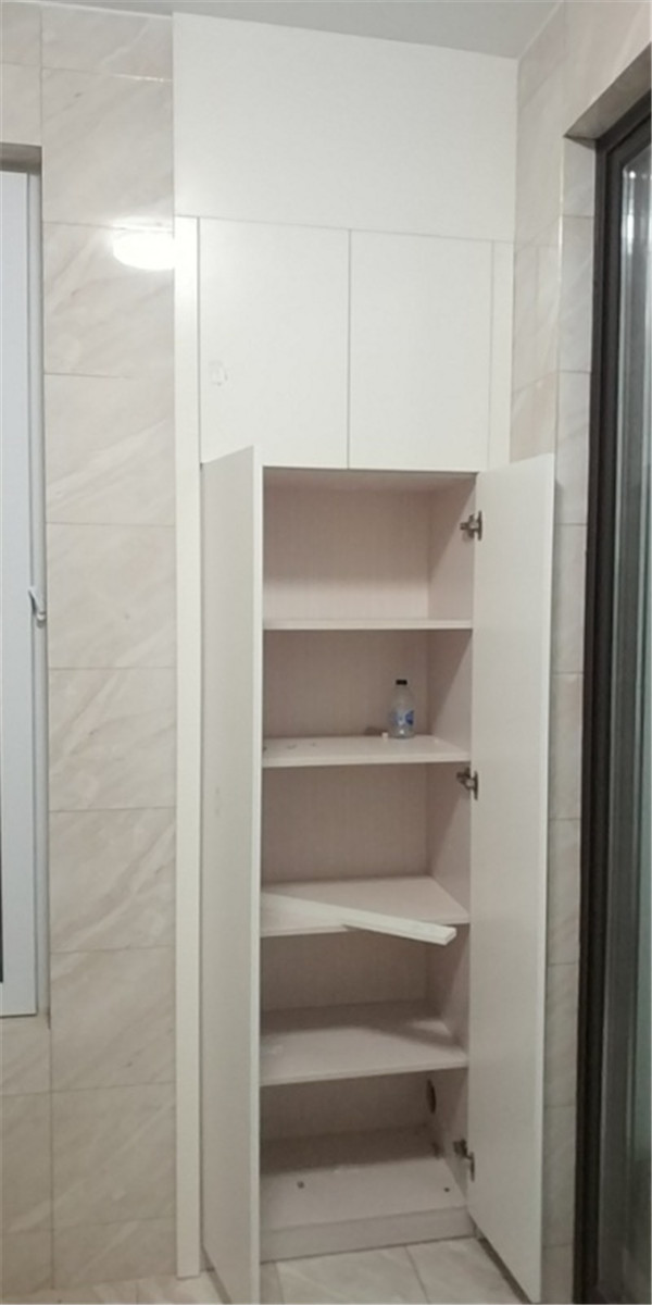 業(yè)主家采用的是兔寶寶板材,柜體顏色是星光松柏,門板顏色是暖白色。門板加的通長拉直器減少了后期門板變形的可能性。