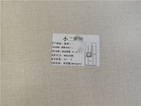 每塊板上都貼有小標簽,方便后期安裝師傅安裝,封邊條上都帶有“優(yōu)端”logo的哦!方便后期售后服務。