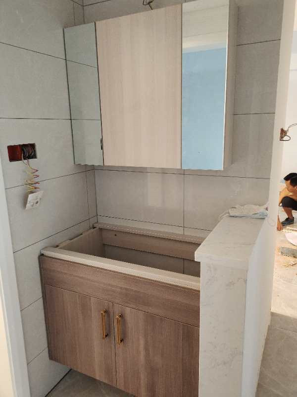 廚房水槽、灶具、浴柜臺(tái)盆放置在現(xiàn)場(chǎng),后期臺(tái)面安裝需用到。柜子安裝好后進(jìn)入臺(tái)面測(cè)量環(huán)節(jié),臺(tái)面量