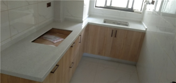 安裝臺面啦,櫥柜柜門用的原木色配上石英石臺面,看著十分清爽舒適。
