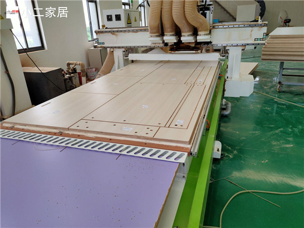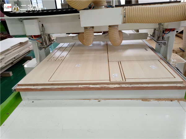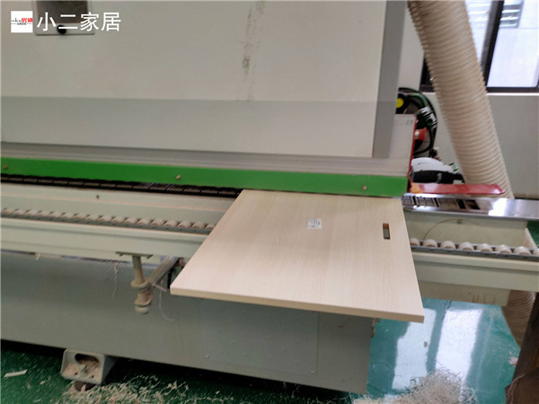 開始制作啦!專業(yè)設備裁板,板材使用平安樹實木多層板E0級制作,有高級的藍光防偽標識哦,