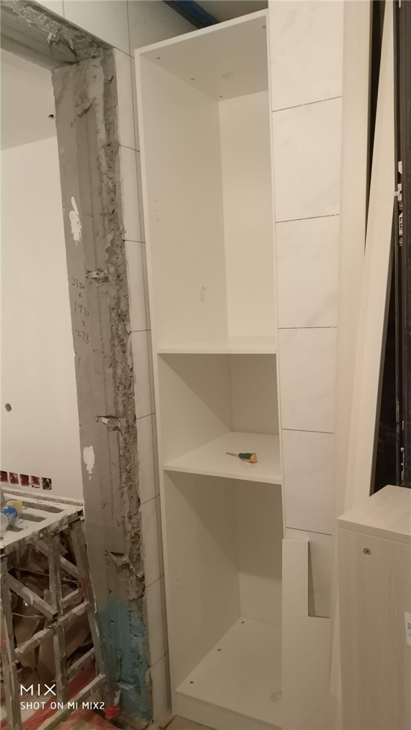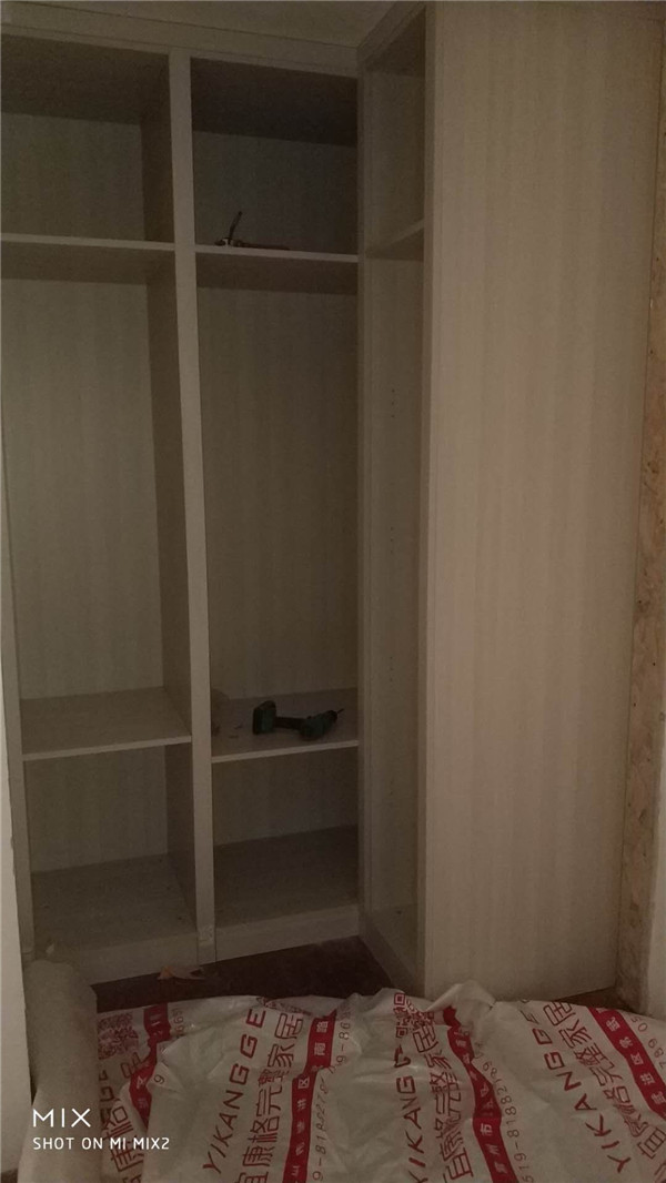 柜體拼裝中,業(yè)主家柜體以淺色調(diào)為主,干凈清爽好打理,天氣炎熱,