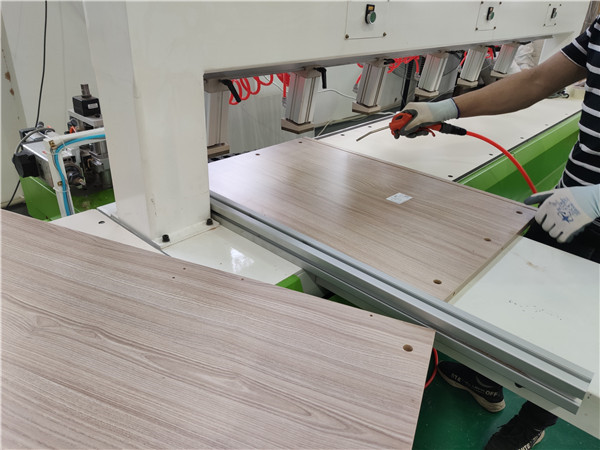 封邊的同時側(cè)面打孔也進(jìn)行時。封邊采用的是1.0厚的pvc封邊條,方便前口倒圓弧,整體效果即美觀又不容易磕碰到。