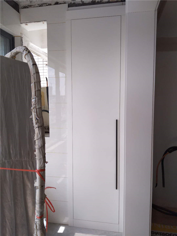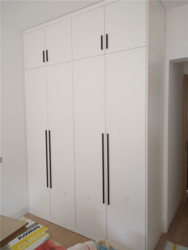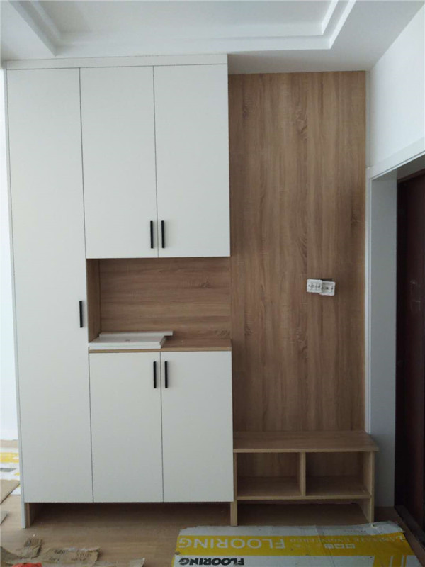 業(yè)主家柜門都用的白色平板門,搭配黑色拉手,鞋柜處做了一個穿鞋的凳子,