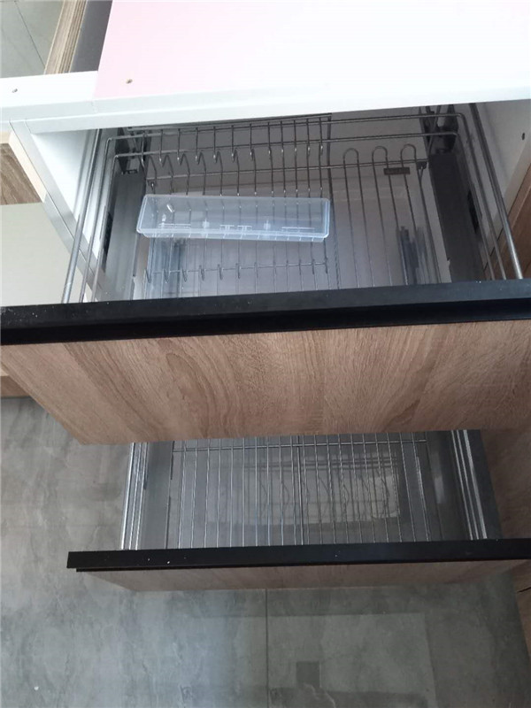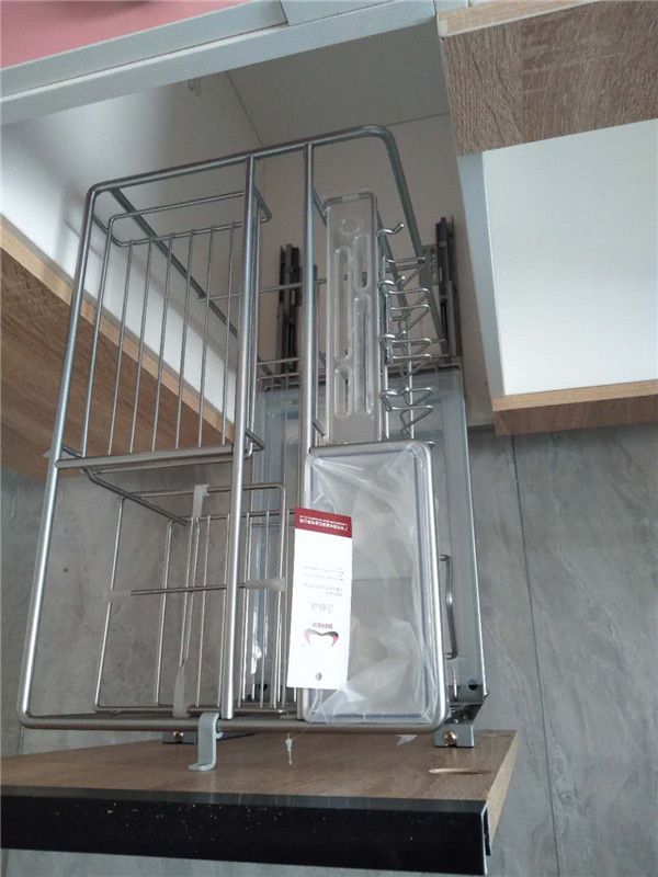 廚房拉籃碗籃調(diào)味料三件套我們標配的諾米銀爵系列的,我們都用塑料膜保護起來了,防止灰塵進入影響導軌的拉伸。