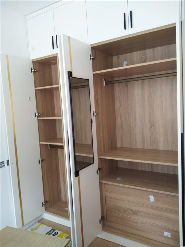 衣柜門板里面加入了到頂拉直器,配了個旋轉(zhuǎn)穿衣鏡,廚房底部我們貼了一層錫紙,