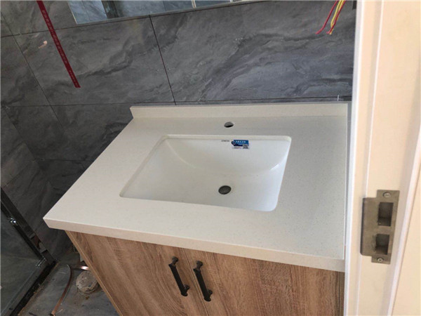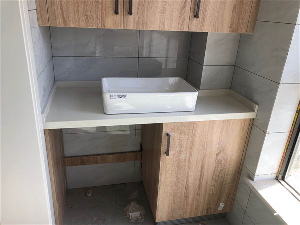 浴柜臺(tái)盆放置在現(xiàn)場(chǎng),后期臺(tái)面安裝需用到。柜子安裝好后進(jìn)入臺(tái)面測(cè)量環(huán)節(jié),