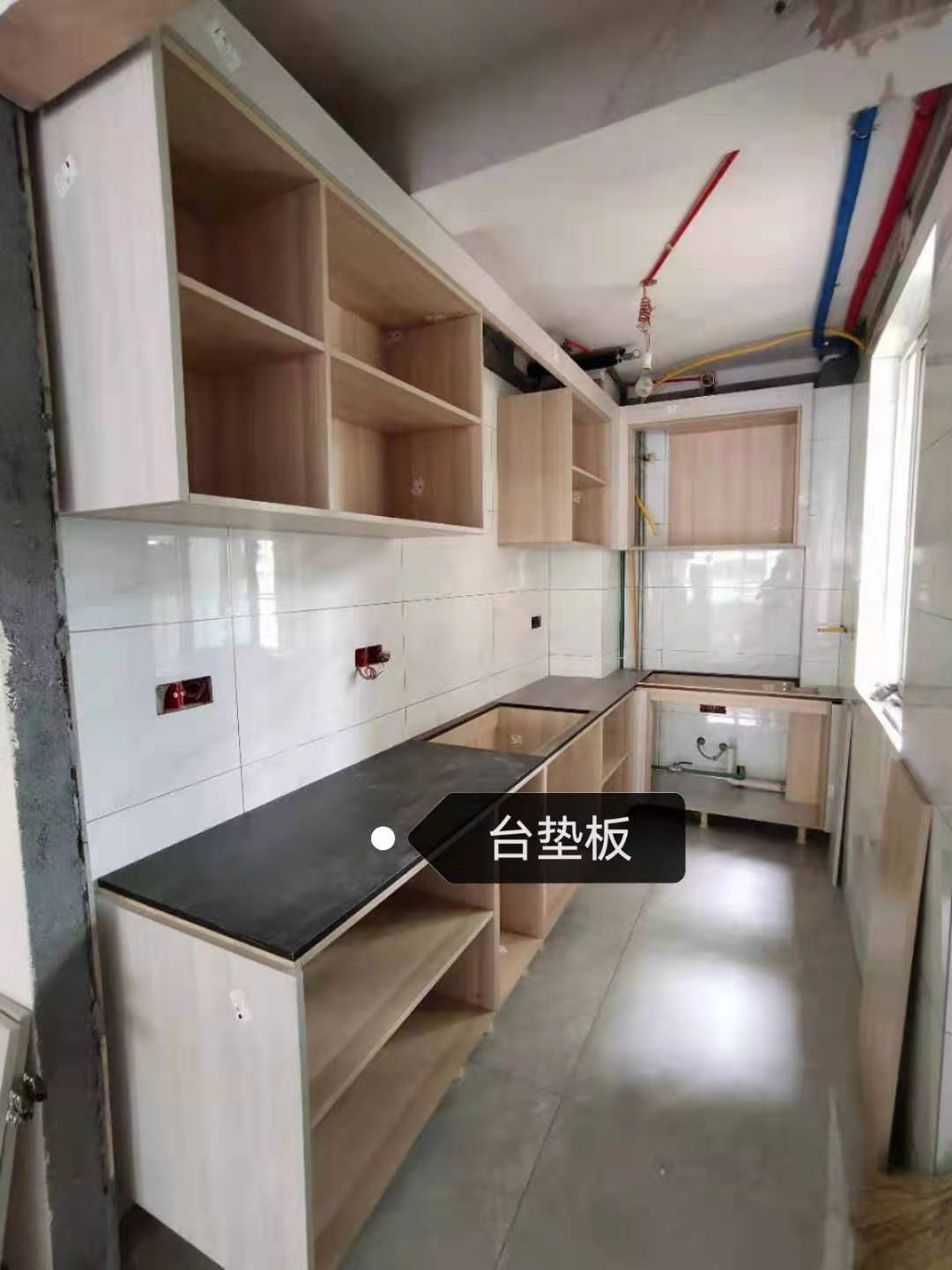 櫥柜臺(tái)面工藝:用實(shí)木多層板做臺(tái)墊板整鋪然后在放石英石臺(tái)面