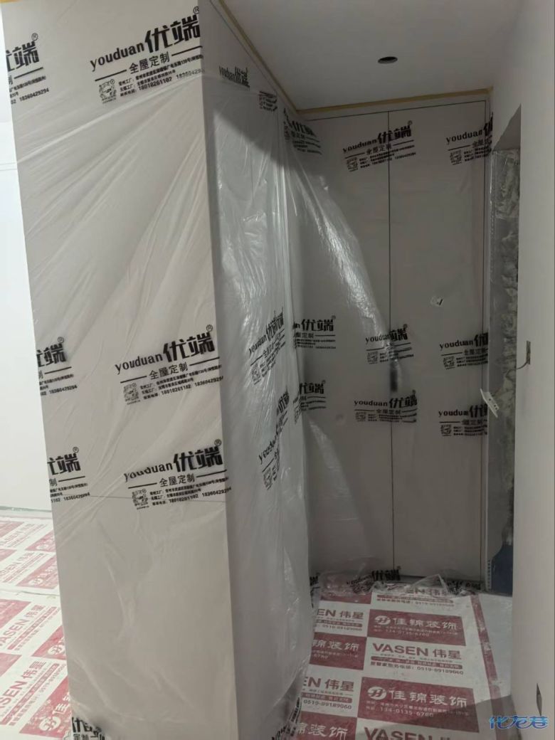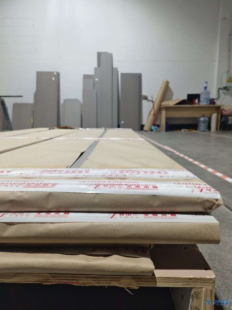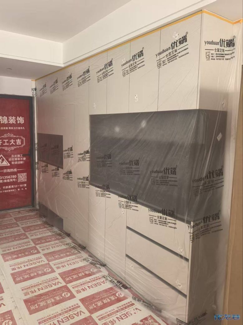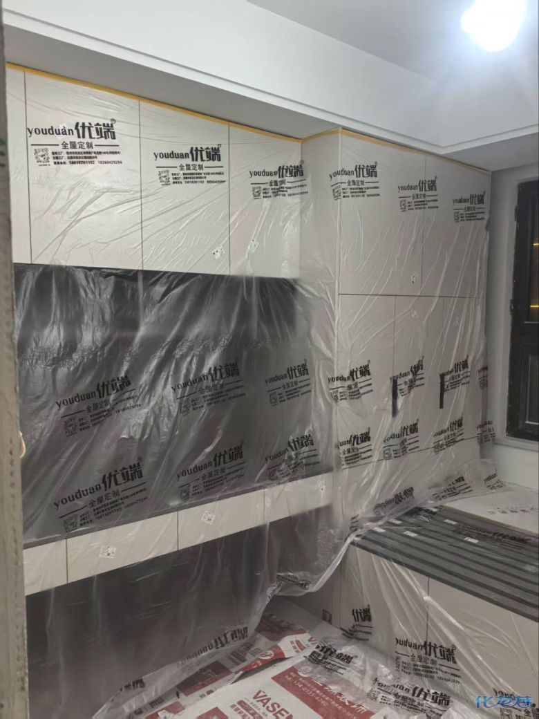 開始封邊啦 封邊的同時,側面打孔也進行時,雙管齊下。 進入打包環(huán)節(jié),我家柜子每塊板都是整個打包起來的,以防運輸過程中劃傷或者磕碰到,跟板材下面墊板一個原理哦!重新訂板會存在色差,這是重點,圈起來必考。全部打包好就可以聯(lián)系客戶送貨咯! 貨已安全送到客戶家了 安裝完成的柜子都用塑料膜保護起來了