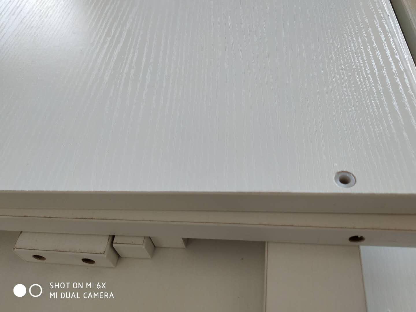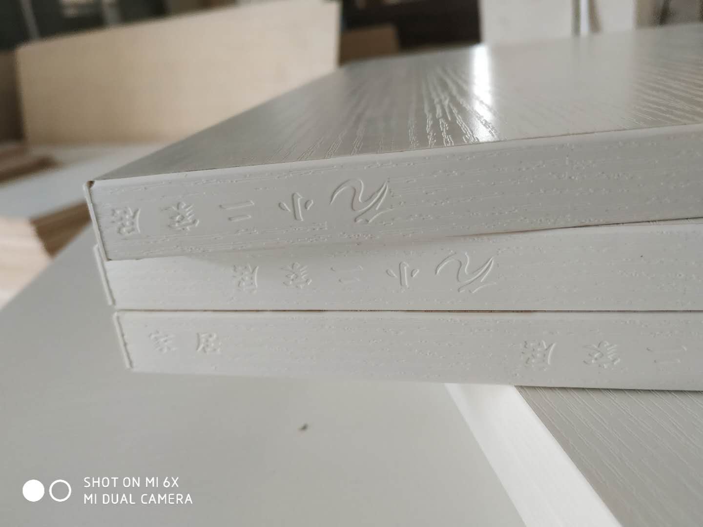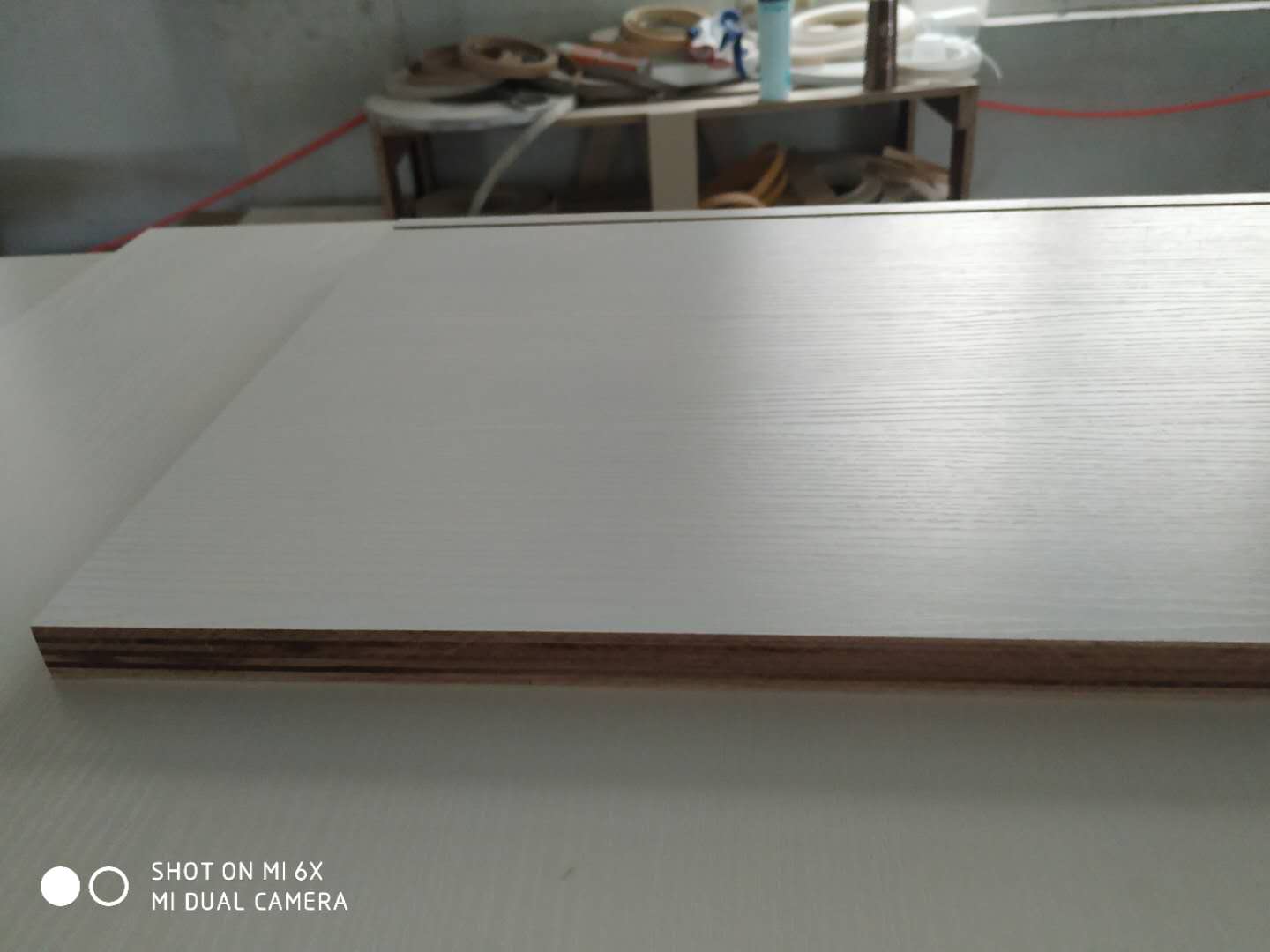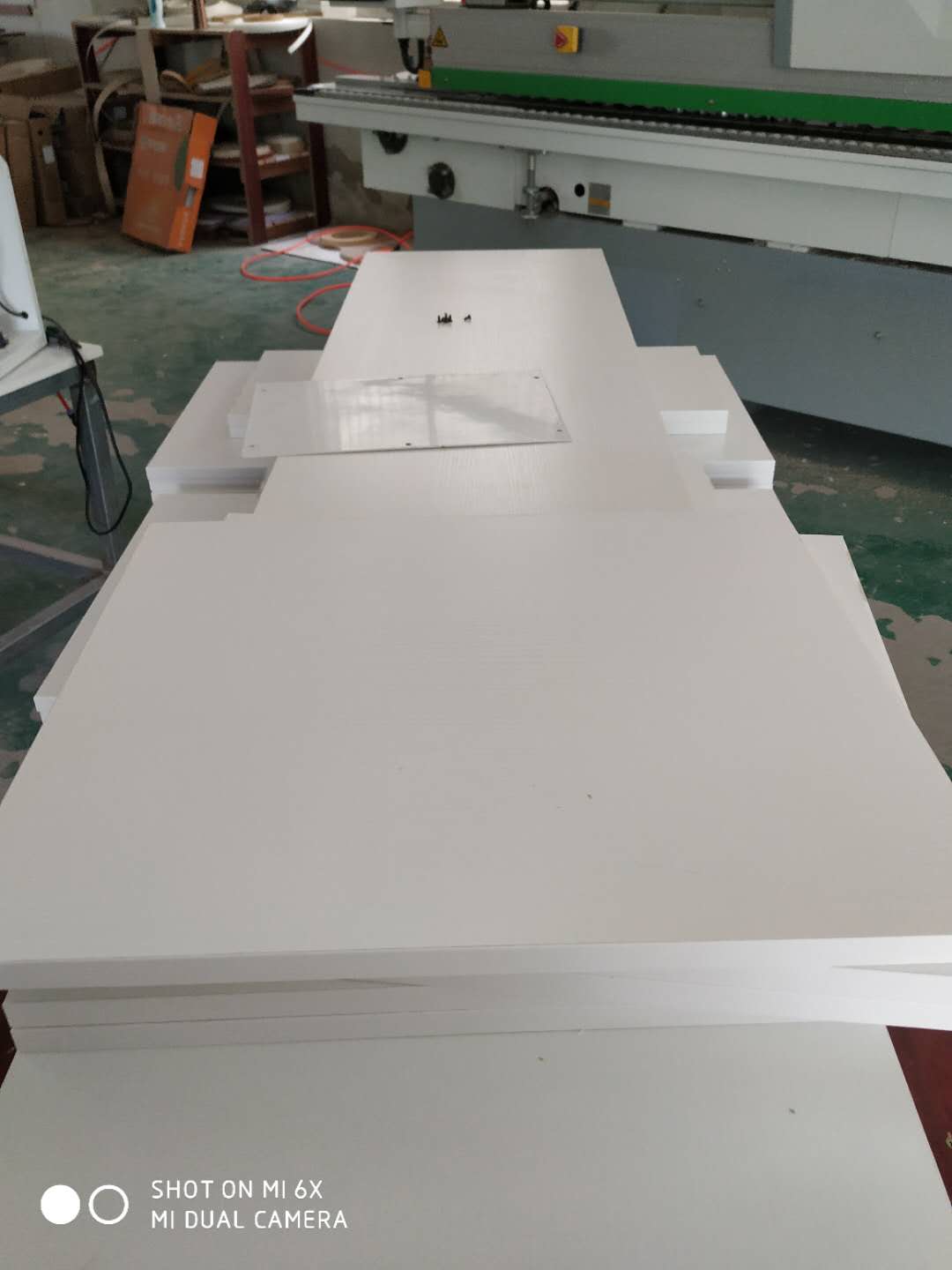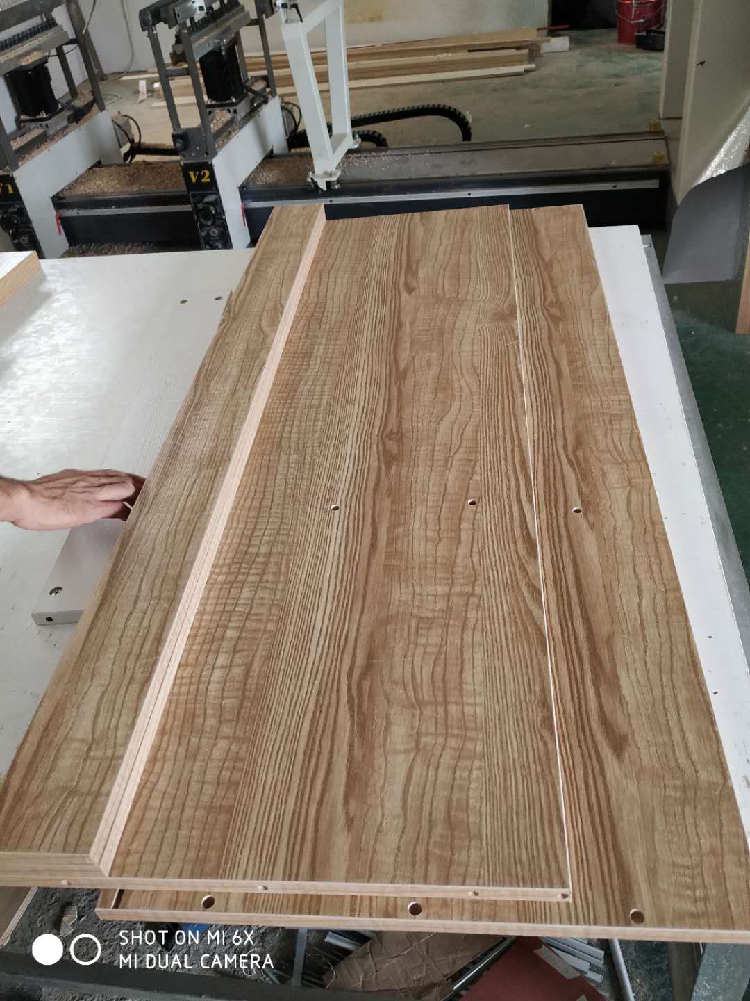 門板封邊準(zhǔn)備打孔,封邊條上印有小二家居的logo!主臥衣柜等打孔中。