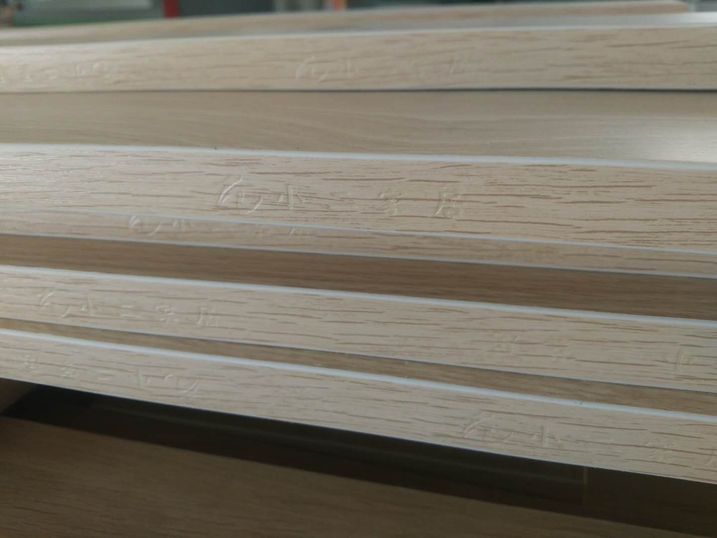 柜體板門板封邊打孔中,封邊條上有小二家居的logo!