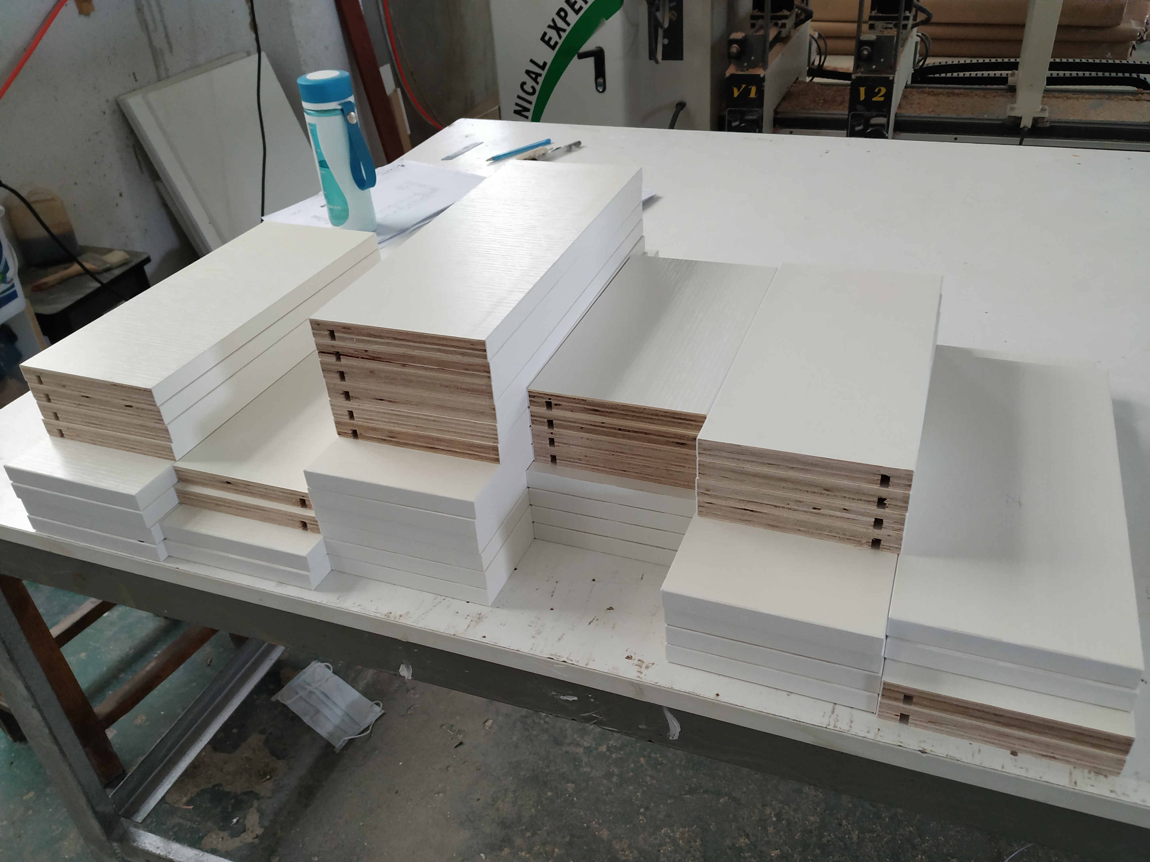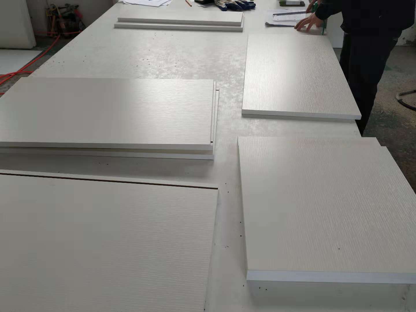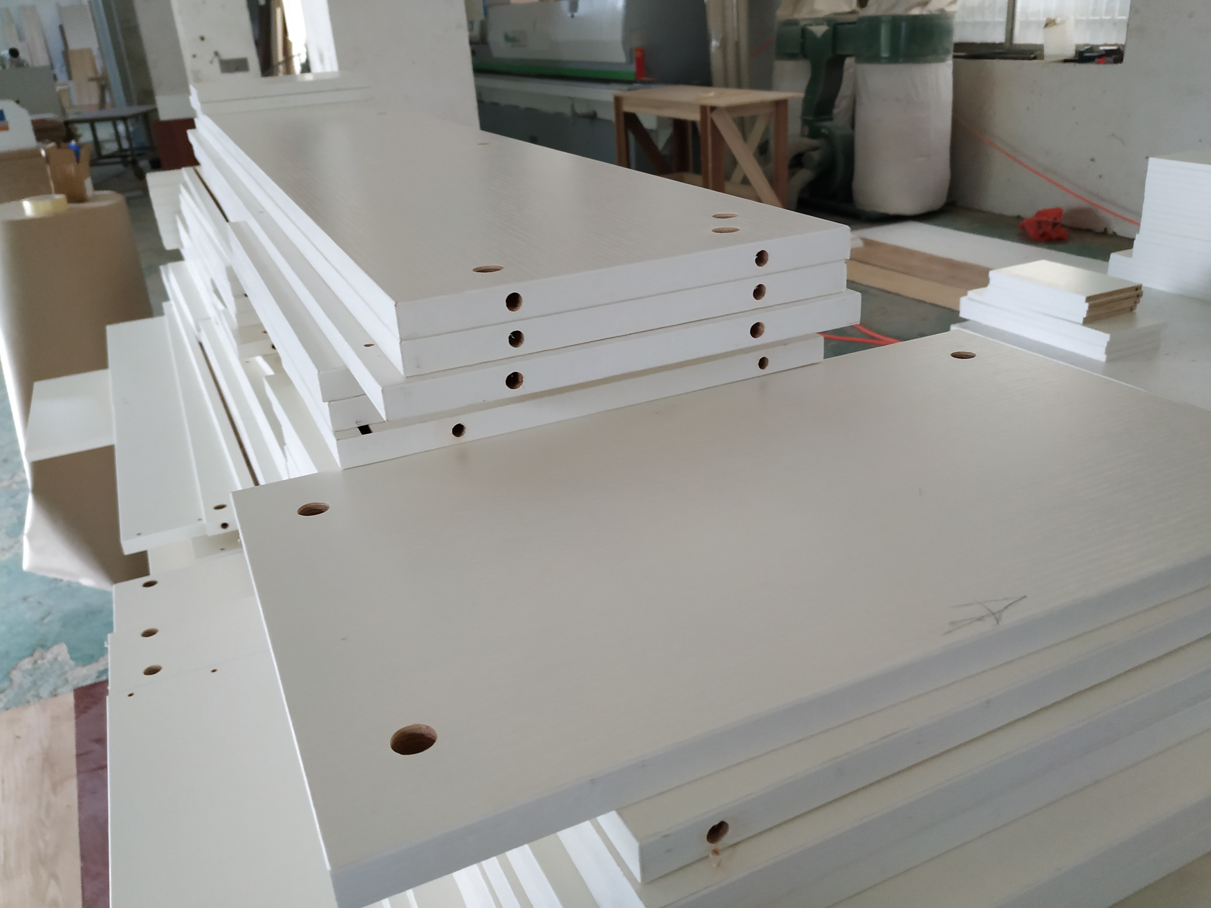 開始制作啦,榻榻米和衣柜板材已經(jīng)打孔完畢,廚房櫥柜板制作中,板材已封邊,待打孔。