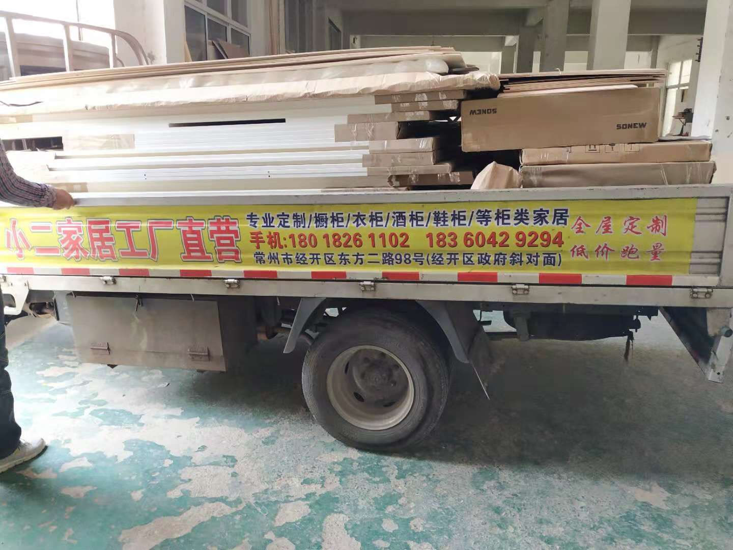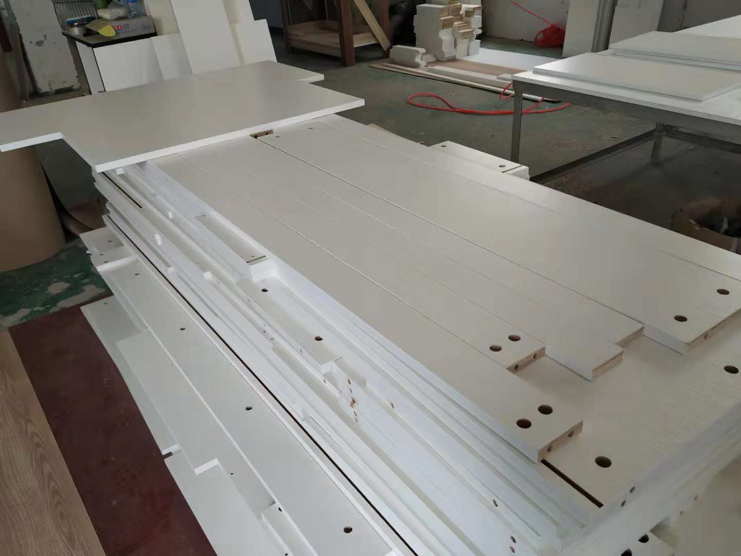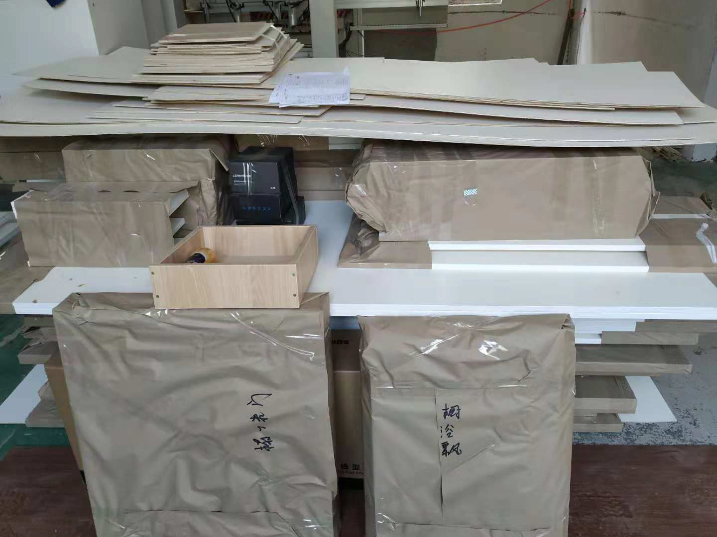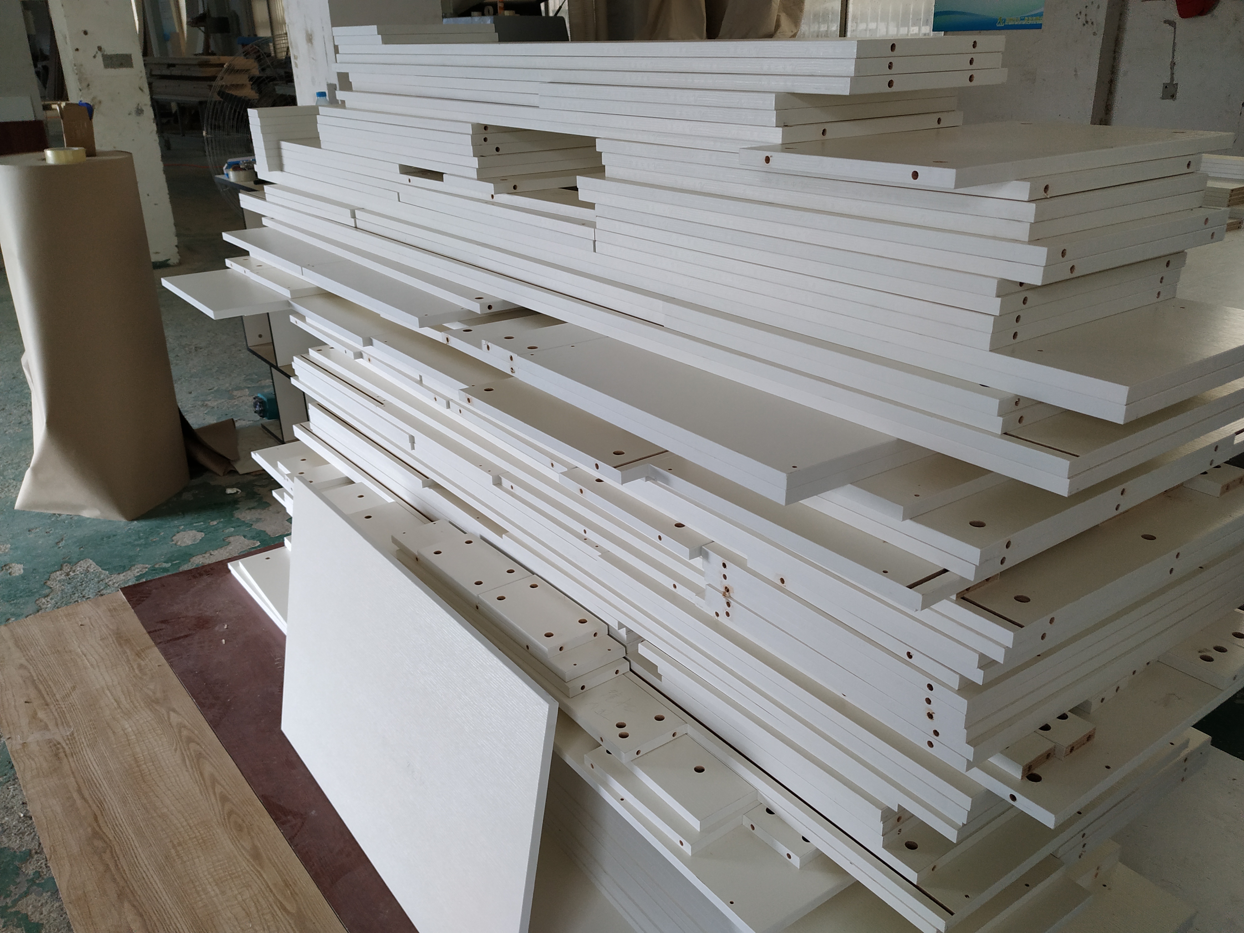 開始制作啦,榻榻米和衣柜板材已經(jīng)打孔完畢,廚房櫥柜板制作中,板材已封邊,待打孔。