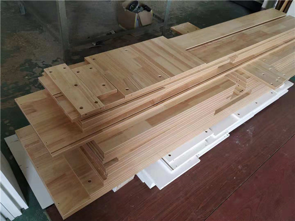 橡膠木板材已經(jīng)裁好板封好邊啦,板材打孔中,上面橡膠木實(shí)木的板材是做衣柜的,下面白色實(shí)木多層板的板材是做櫥柜的。