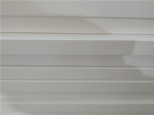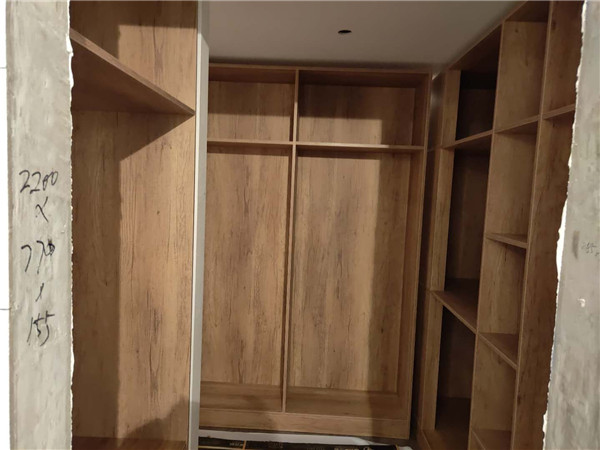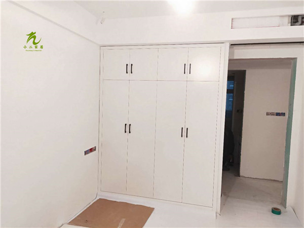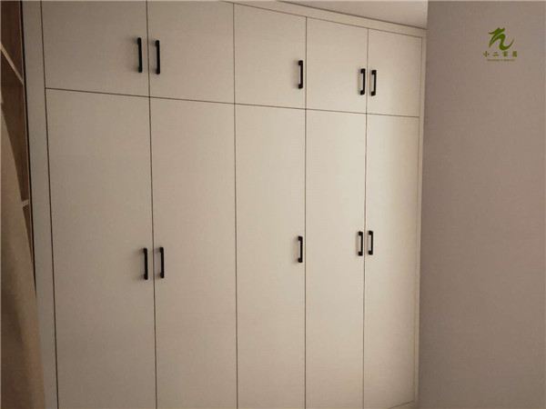 衣柜,衣帽間,餐邊柜和陽臺吊柜的柜體板材已經(jīng)封好邊,打好孔啦,封邊條上印有小二家居的logo。
