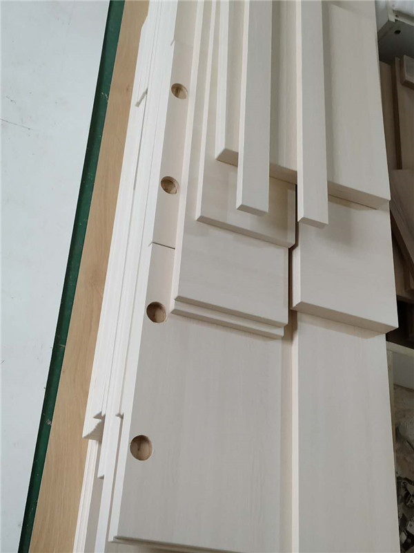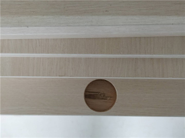 圖6是柜子的門板板材,打的大圓孔是用來裝鉸鏈的,板材使用平安樹金沙榆色實木多層板制作,