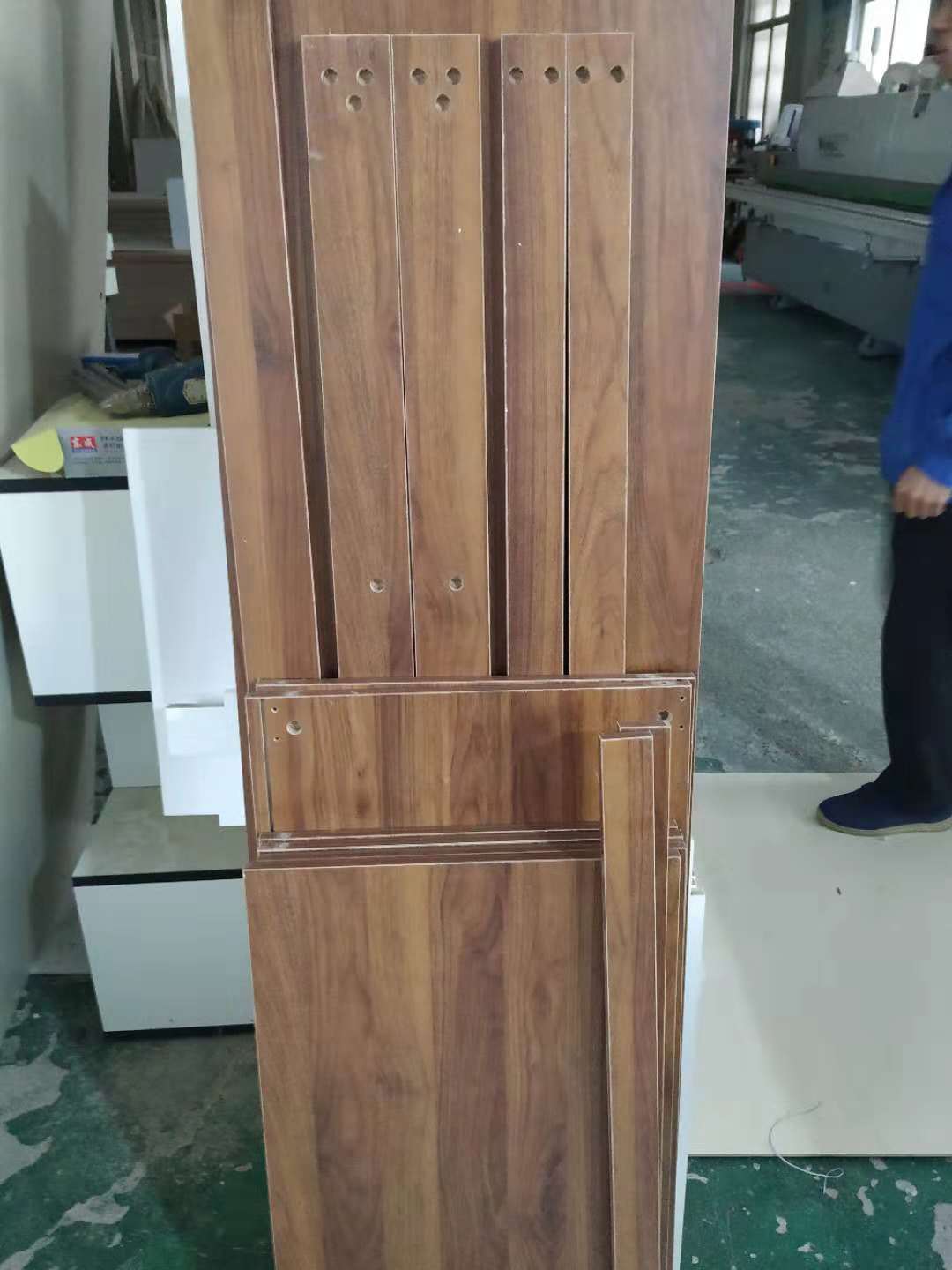 開(kāi)始制作啦,櫥柜板材和小鞋柜板材打孔中,板材使用平安樹(shù)實(shí)木多層板制作,柜體顏色是鴻運(yùn)當(dāng)頭,門(mén)板是雙飾面暖白色哦。