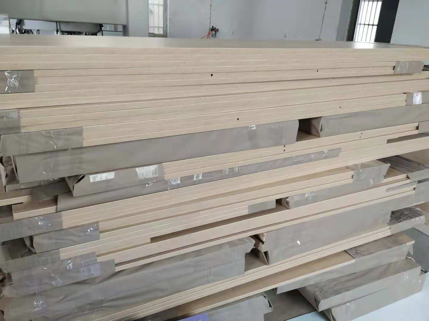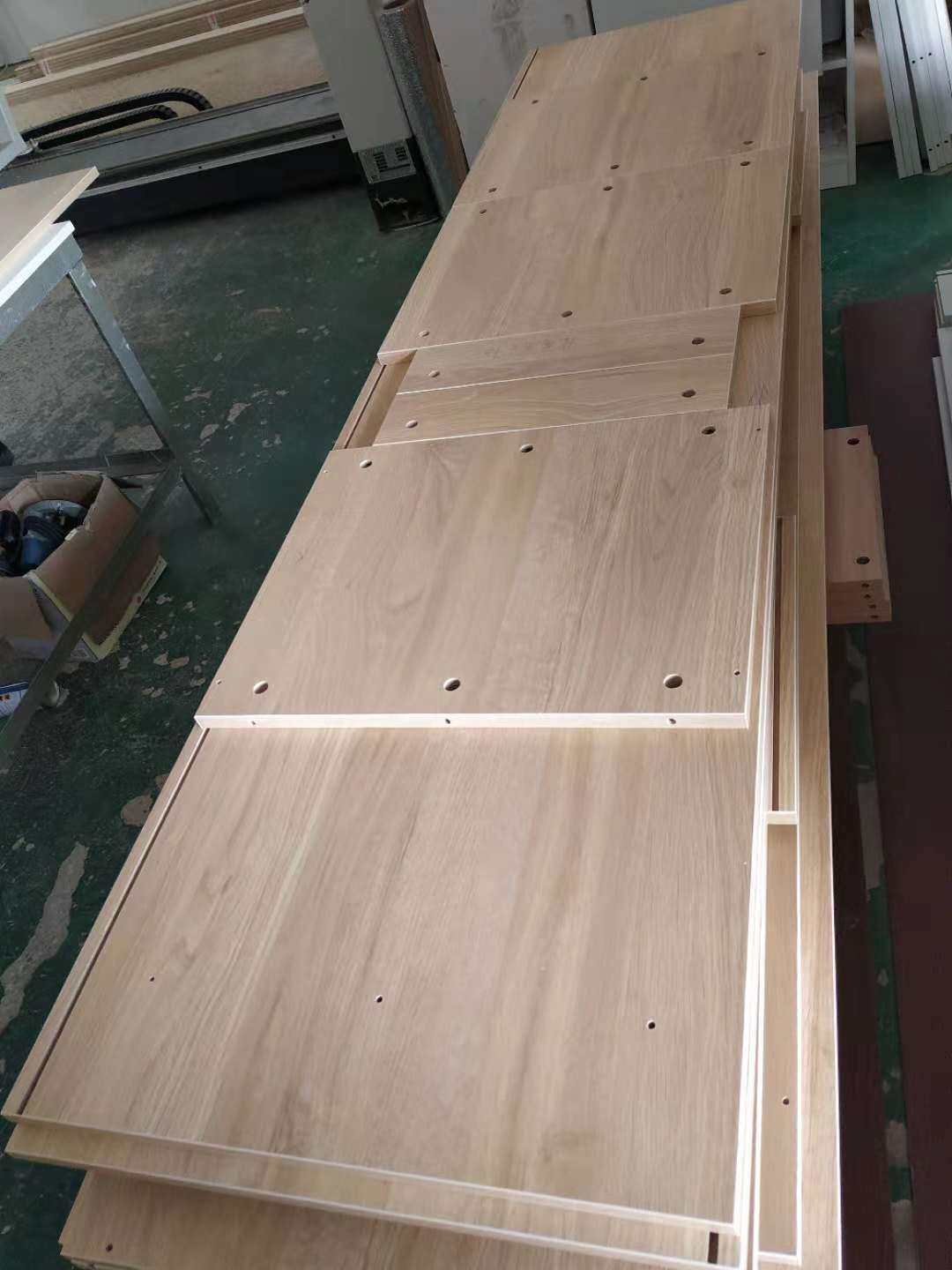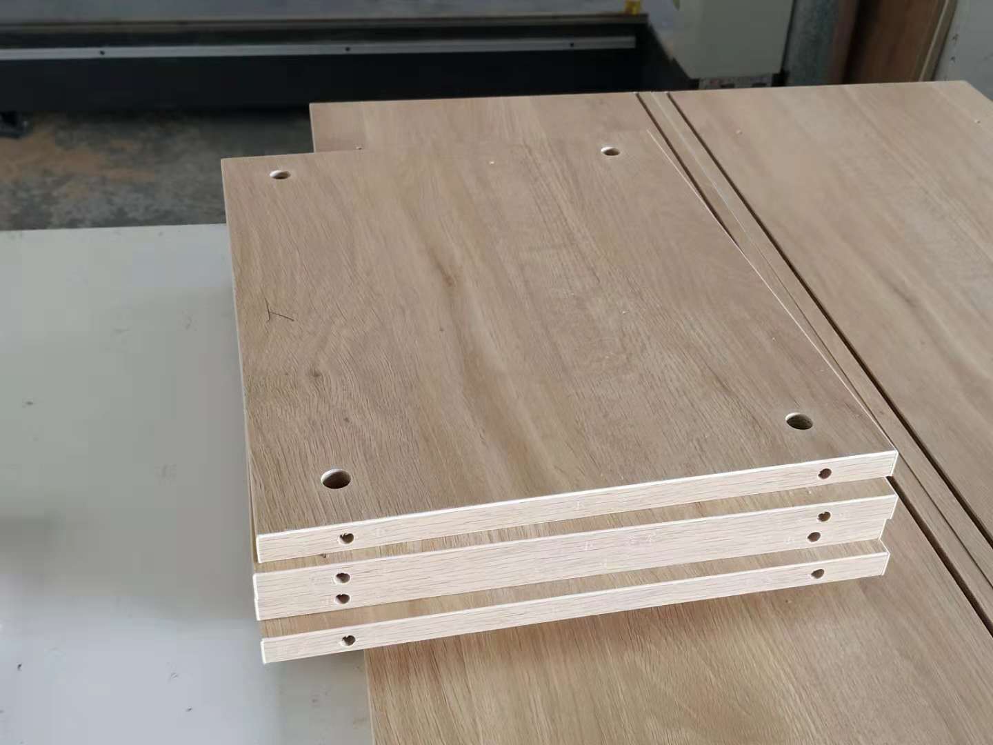 開始制作啦,主臥飄窗和北房間小柜的板材已經(jīng)封好邊打好孔了。