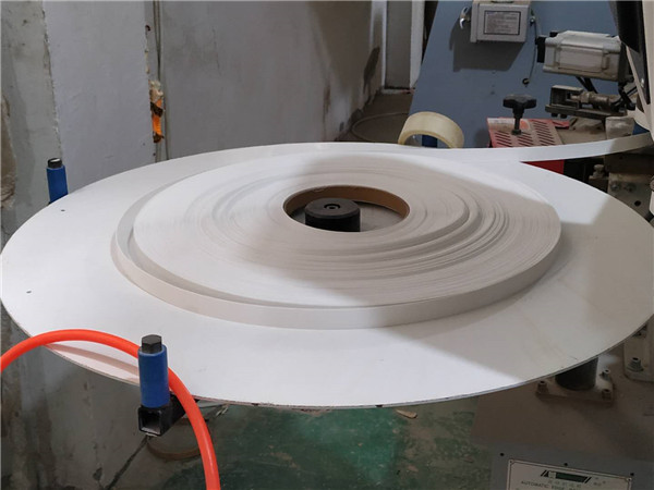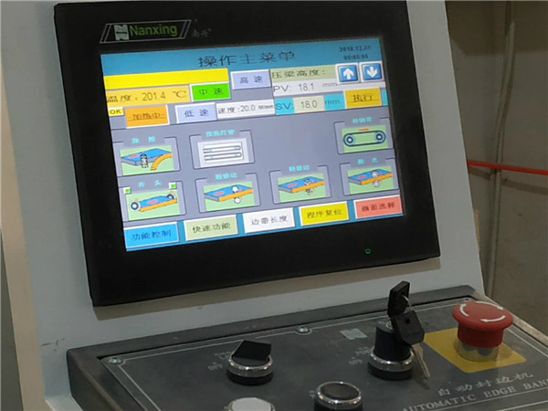 開始封邊啦,機器溫度到達200℃封出來的邊牢固,采用進口法國波士熱熔顆粒膠,封邊條上帶有小二家居的logo!