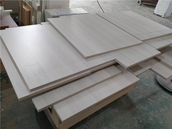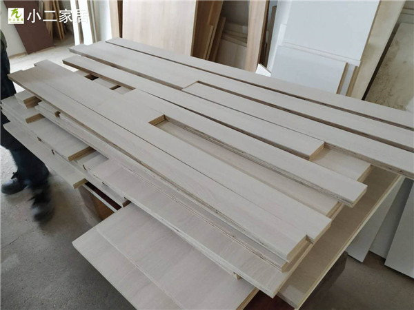 另一種顏色的板材是平安樹銀沙榆色實木多層板,用來制作櫥柜板,板材裁板中。