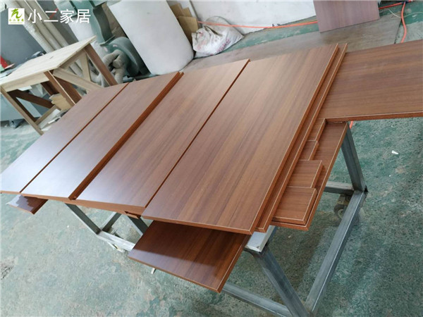 開始制作啦,紅棕色的板材是平安樹柚木色實木多層板,用來制作書桌和門板,板材已經(jīng)封好邊啦,下一步要打孔了,