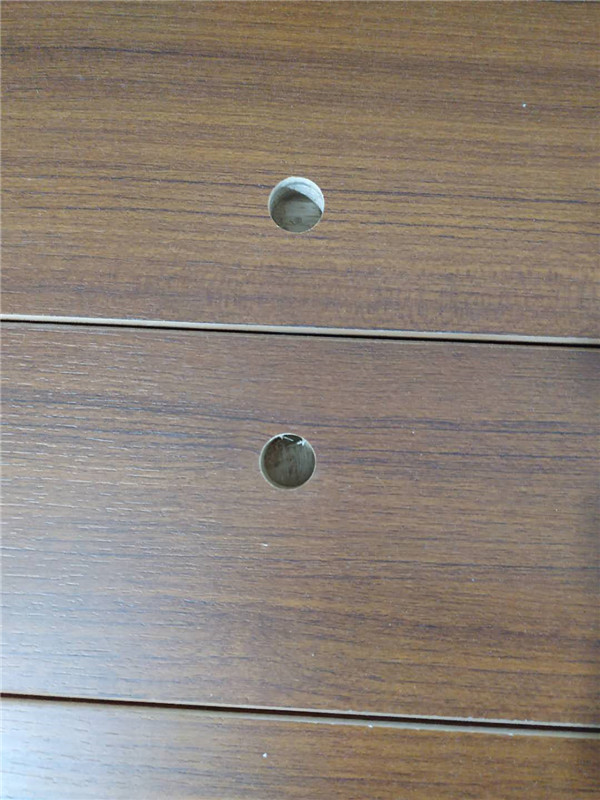 門板板材的鉸鏈孔是師傅用機器手工打洞的,后期還會經(jīng)過一次修邊。銀沙榆色的櫥柜板材已經(jīng)封好邊啦~今天也會打孔啦~
