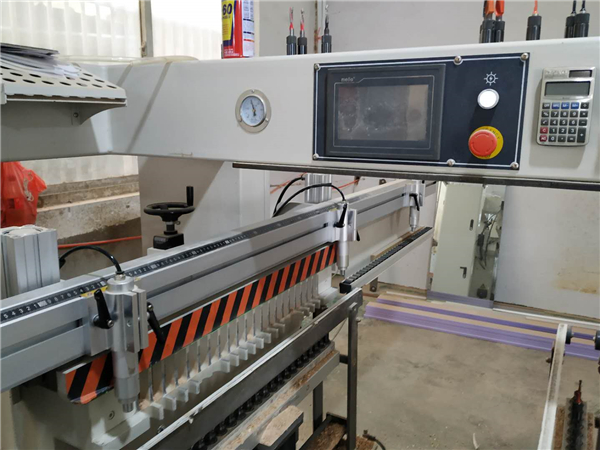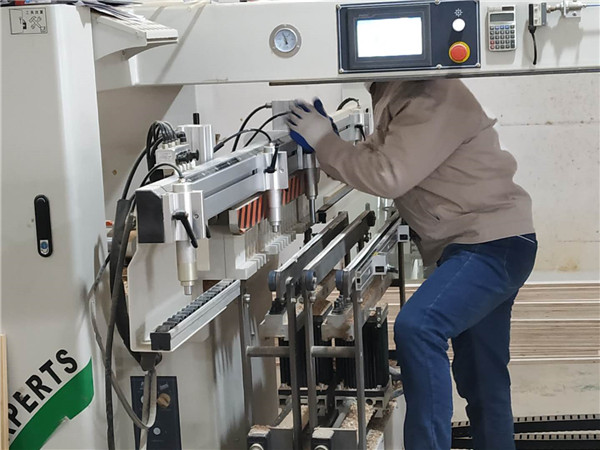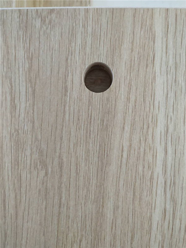 鞋柜板制作中,板材已經(jīng)裁好板封好邊啦,現(xiàn)在在打孔中,師傅正在調(diào)整機器,打出來的孔就是圖5的樣子啦,很圓整,沒有爆邊。