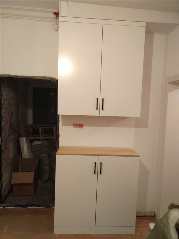 柜子已經(jīng)裝好啦,還差臺面了,清水橡木色柜體配上暖白色柜門的經(jīng)典搭配,效果很百搭哦!