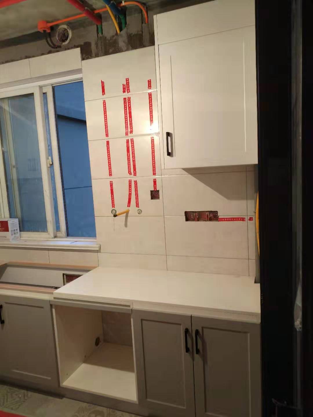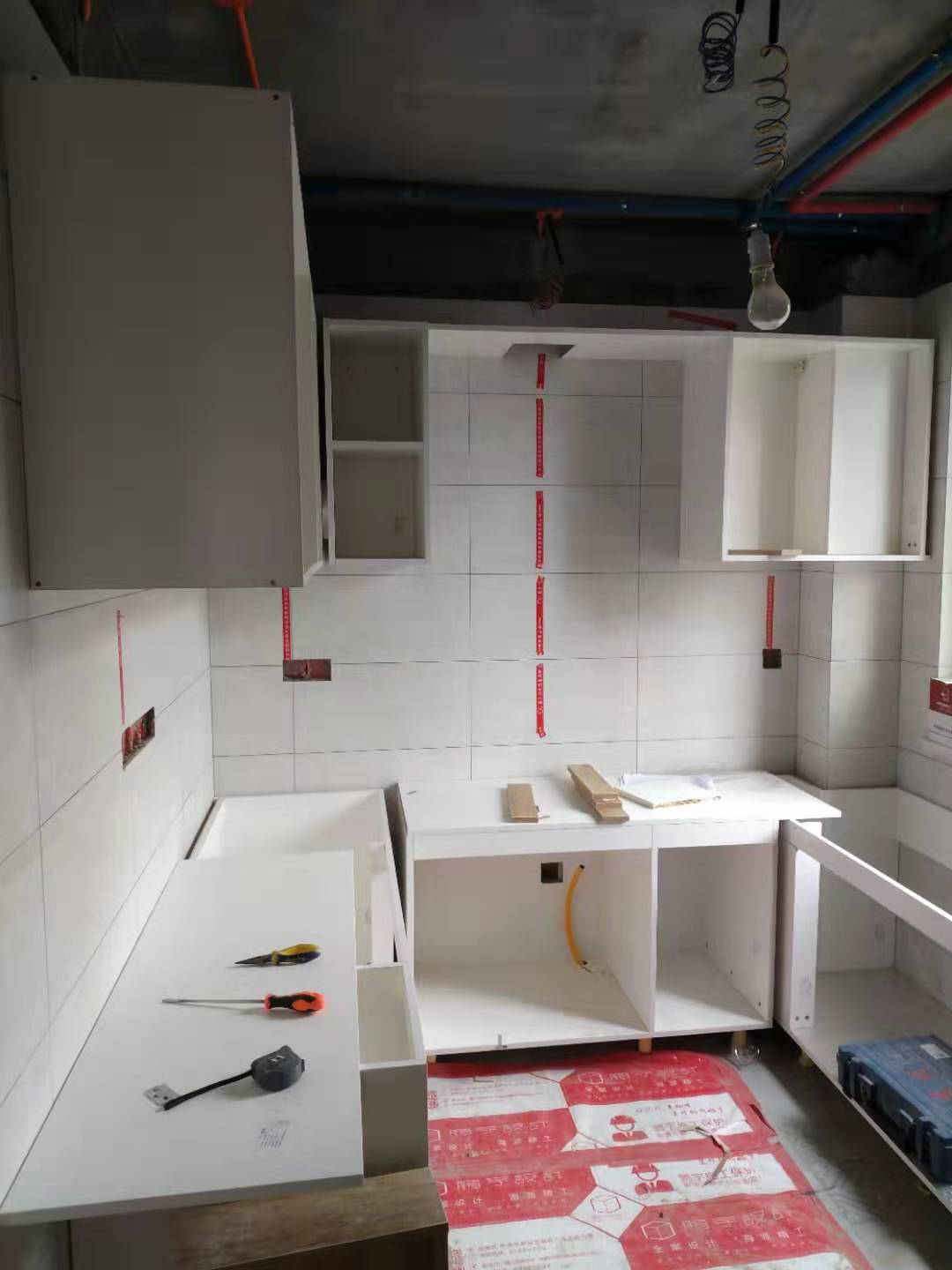 安裝進(jìn)行中,五金標(biāo)配:pvc雙層踢腳線、ABS尼龍柜腳、和居拉手,海蒂詩(shī)導(dǎo)軌、諾米鉸鏈。不得不說(shuō)師傅挺給力的,大半天時(shí)間柜體裝的差不多了,點(diǎn)贊