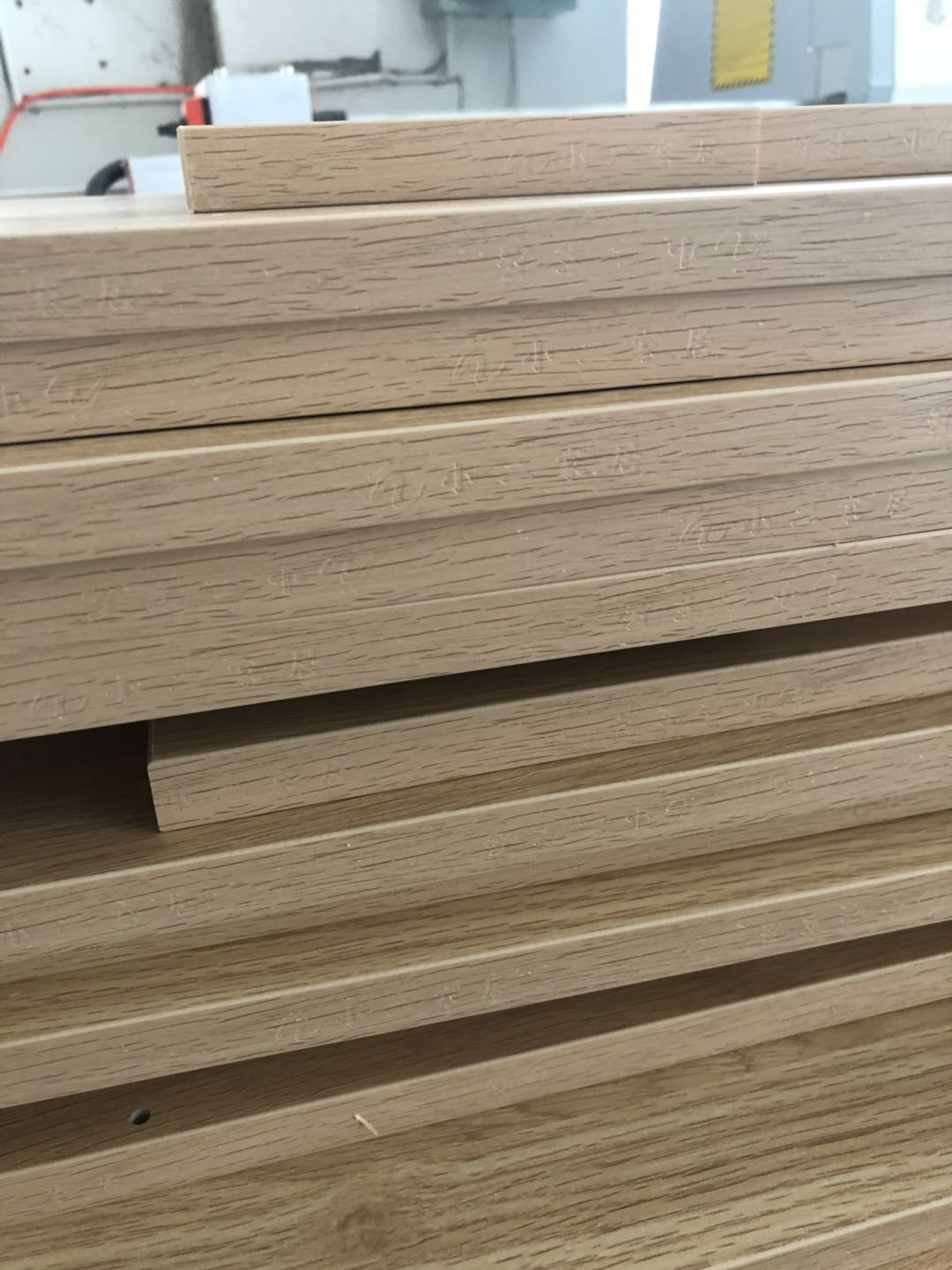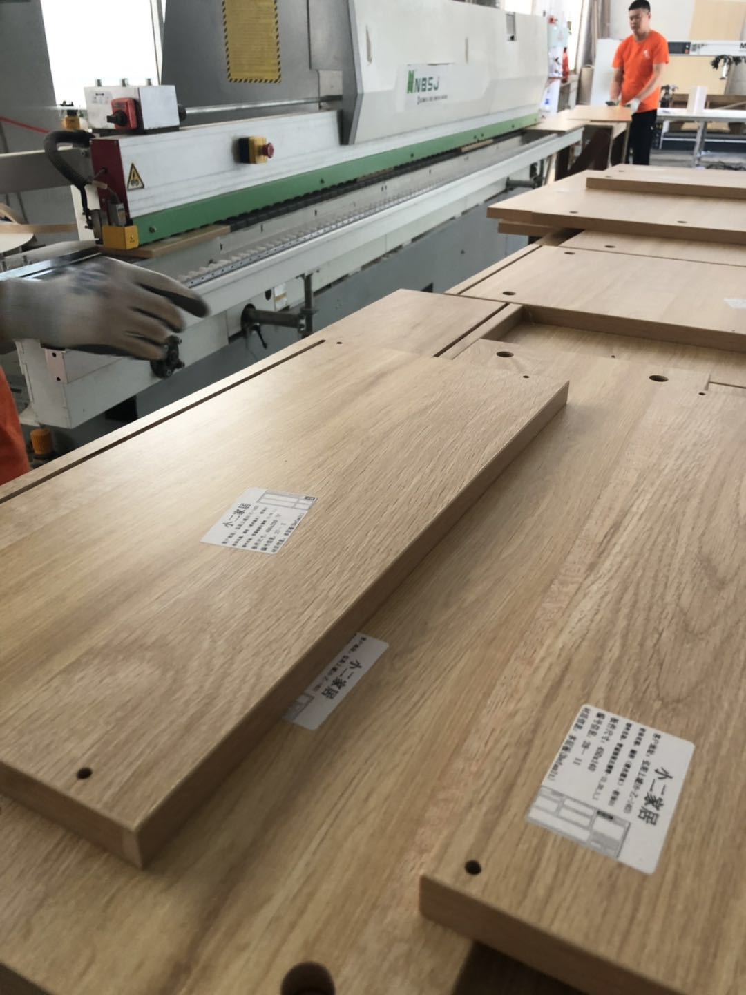 柜體封邊中,采用法國(guó)波士熱熔顆粒膠,設(shè)備溫度達(dá)到200°C封出來(lái)的邊牢固,沒(méi)有爆邊~封邊條上有小二家居的Logo哦