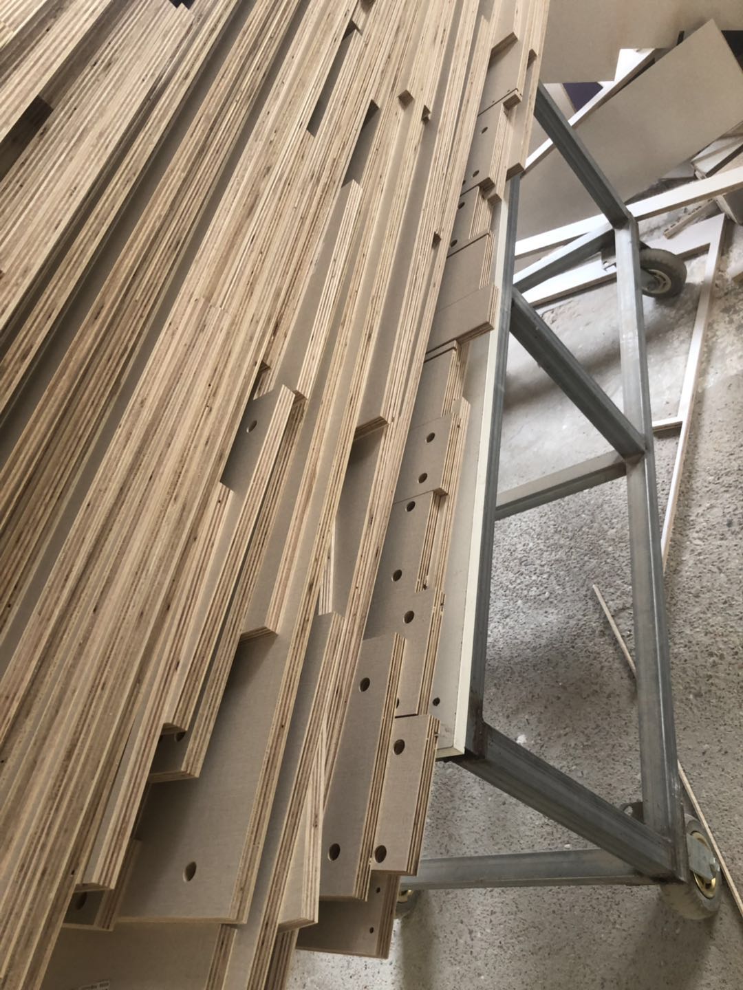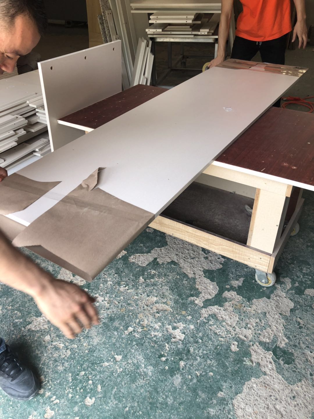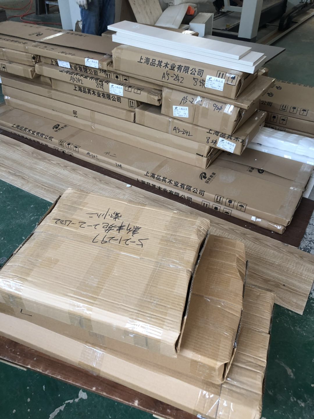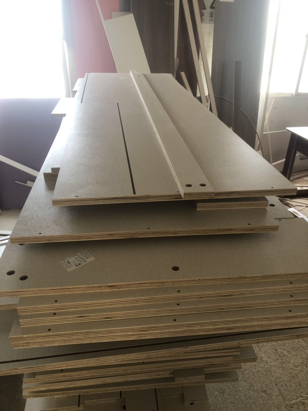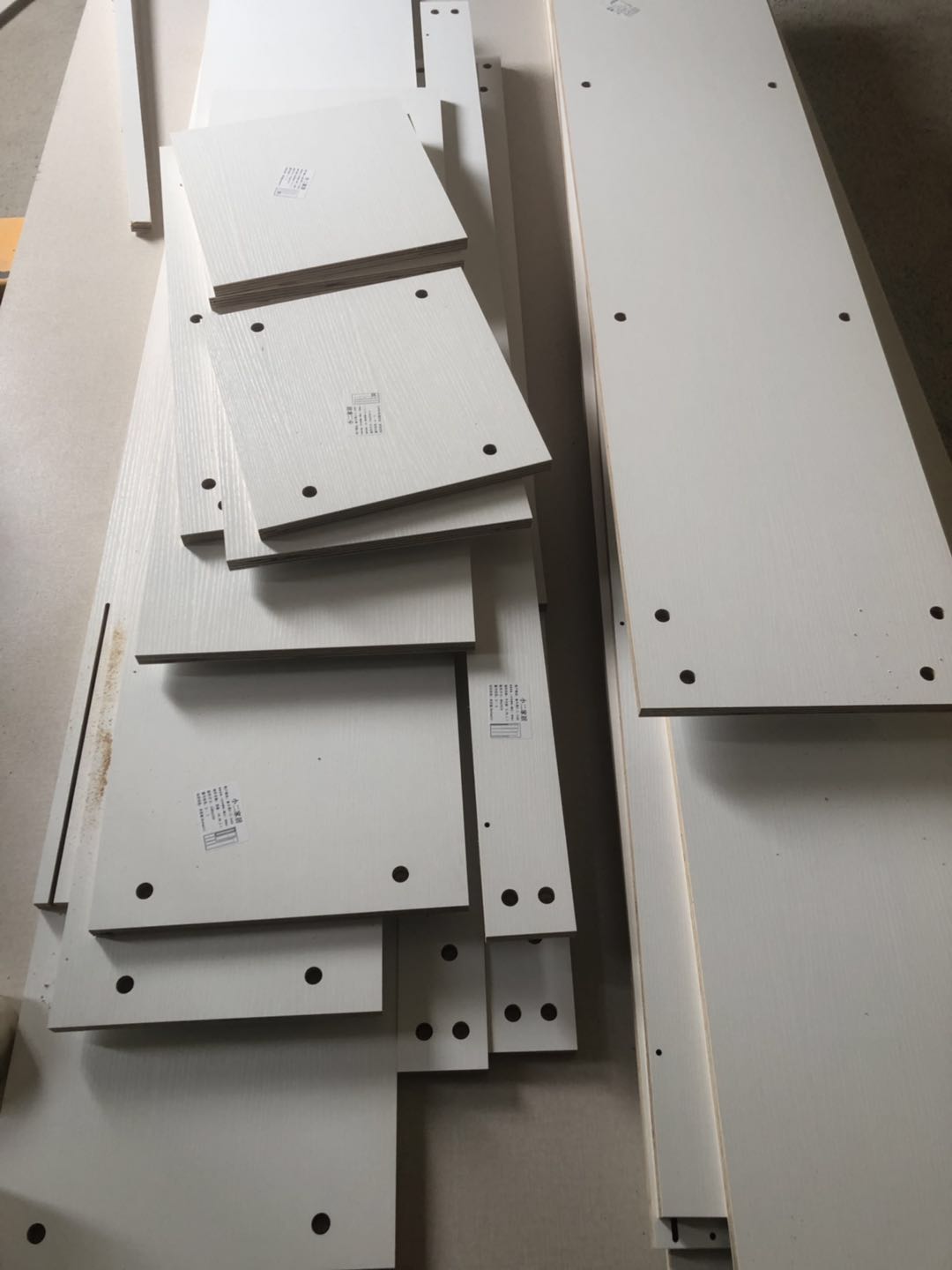 開始制作啦,裁板打孔中,圖1是陽臺(tái)吊柜,板材使用平安樹暖白色實(shí)木多層制作,有高級(jí)的藍(lán)光防偽標(biāo)識(shí)哦,圖4-6是衣柜的柜體板,板材使用平安樹皮紋-1實(shí)木多層制作,裁出來的板沒有爆邊~