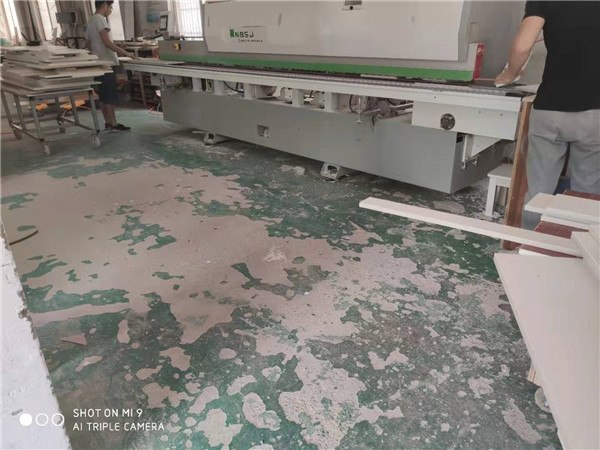 開始封邊啦!封邊采用法國波士熱熔顆粒膠,設(shè)備溫度達(dá)到200°C封出來的邊牢固,沒有爆邊,完美無瑕。客戶家采用的是平安樹實木多層板,