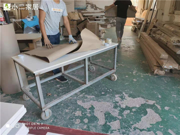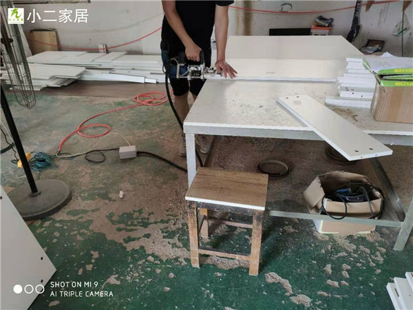 封邊條上帶有小二家居logo的哦,方便后期售后服務(wù)。師傅們分工合作,封邊打孔同時(shí)進(jìn)行,這樣就能早點(diǎn)送貨到客戶家啦!