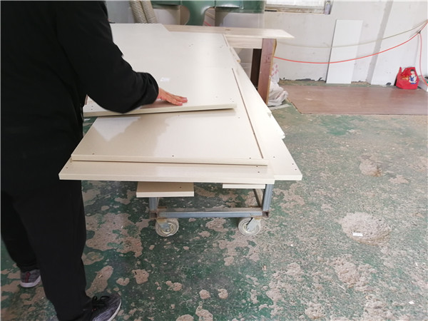 開始封邊咯!客戶家的柜子有點小多哦。封邊采用法國波士熱熔顆粒膠,設(shè)備溫度達(dá)到200°C封出來的邊牢固,沒有爆邊,完美無瑕。每塊板上都貼有小標(biāo)簽,方便后期安裝師傅安裝。