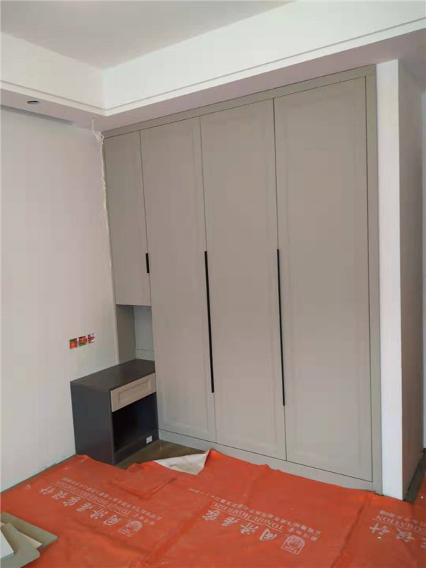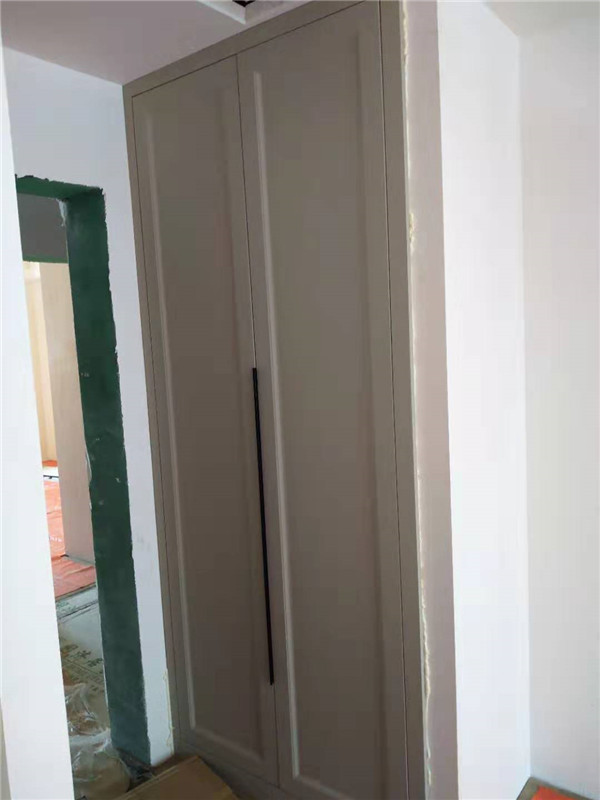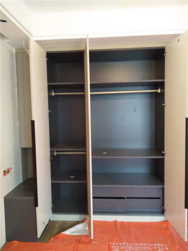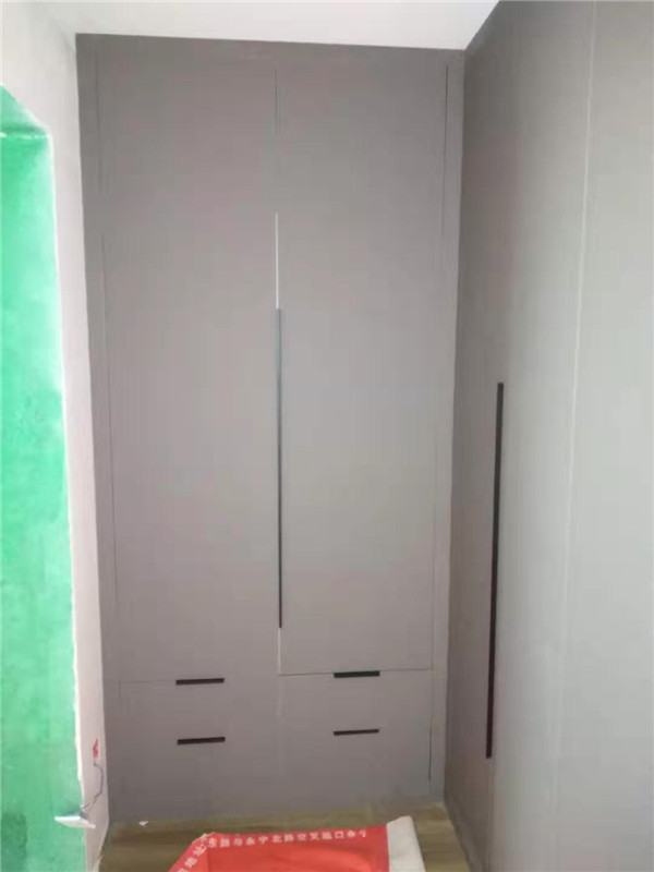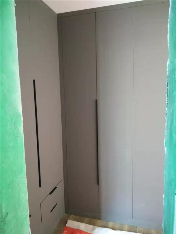 業(yè)主家的餐邊柜、鞋柜和兒童房衣柜都用了統(tǒng)一的平安樹鐵灰板制作,這么耐看的顏色后期效果肯定很棒!