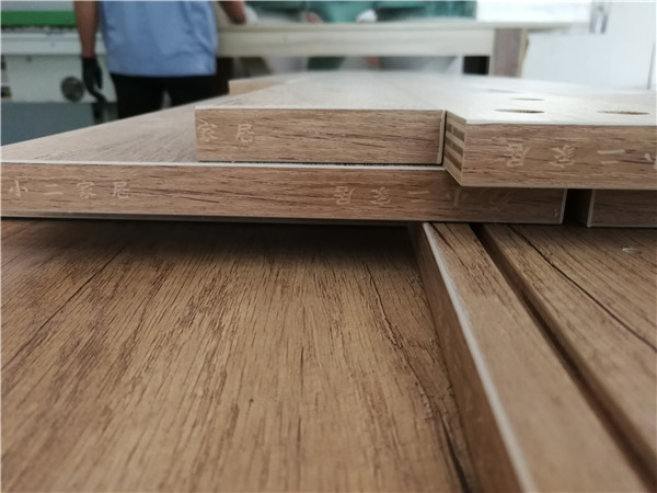 封邊同步進(jìn)行中,很速度哦。封邊采用法國(guó)波士熱熔顆粒膠,設(shè)備溫度達(dá)到190-200°C封出來的邊牢固,沒有爆邊,完美無瑕。每塊板上都貼有小標(biāo)簽,方便后期安裝師傅安裝,封邊條上都帶有小二家居logo的哦!方便后期售后。