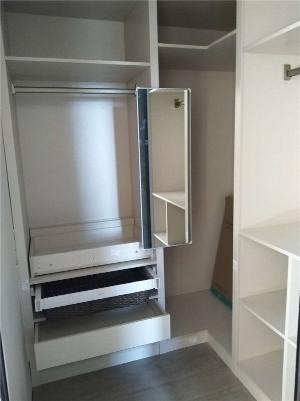 櫥柜諾米拉籃三件套,安裝師傅都保護(hù)起來啦,以防落灰導(dǎo)致導(dǎo)軌不好拉,小細(xì)節(jié)做的還是很到位的,點(diǎn)個(gè)贊。書桌配色很吸人眼球哦,表示很心水,衣帽間安裝了全身鏡,