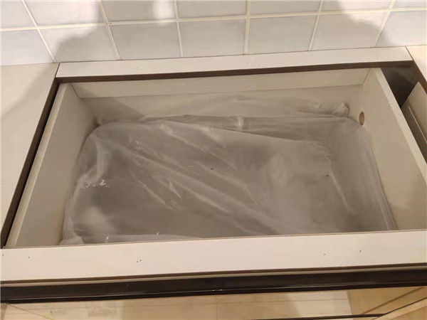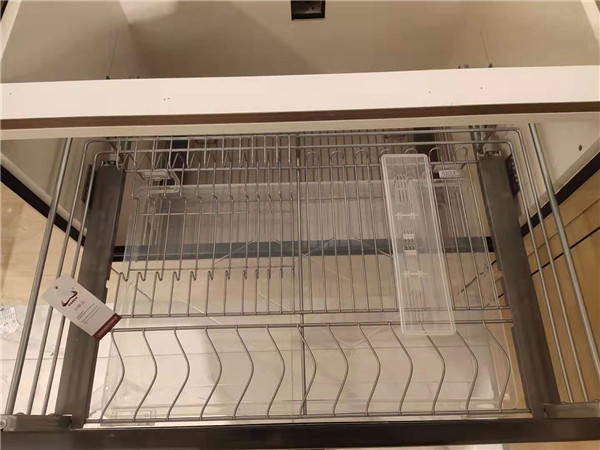 廚房水槽都鋪有防水錫紙,拉籃也都用塑料膜保護(hù)起來了,防止灰塵進(jìn)入影響導(dǎo)軌的拉伸。