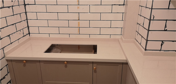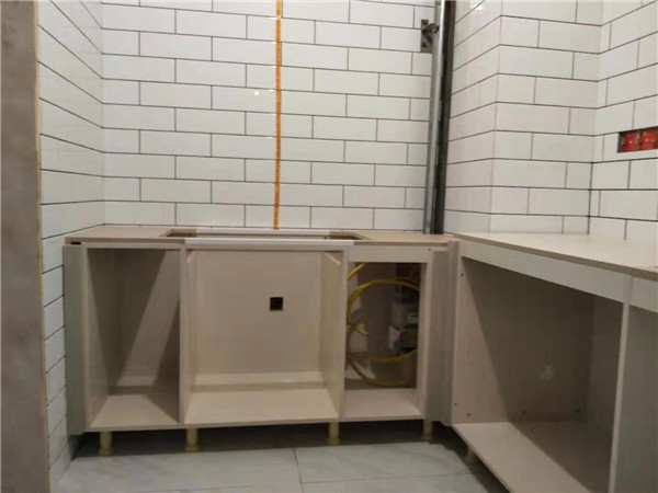 再來看看廚房部分,水槽都鋪有防水錫紙,拉籃也都用塑料膜保護起來了,防止灰塵進入影響導軌的拉伸。ABS尼龍柜腳和雙面踢腳線更耐用哦