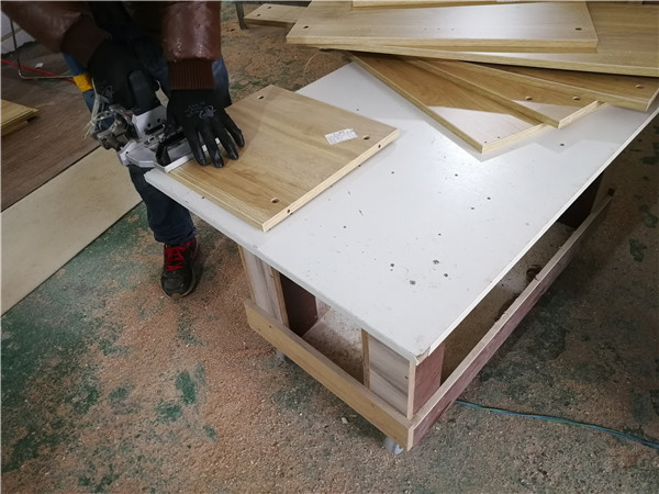 倒角、打孔中,倒角的好處:第一整體效果美觀,第二以防后期開(kāi)門磕碰到。等著打包了