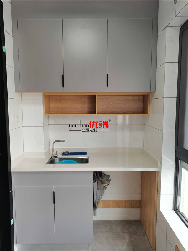 經(jīng)過(guò)幾天的努力,柜子的整體效果出來(lái)啦,色彩搭配還是很養(yǎng)眼的。櫥柜采用的晶鋼門(mén)后期有油煙也比較好打理。