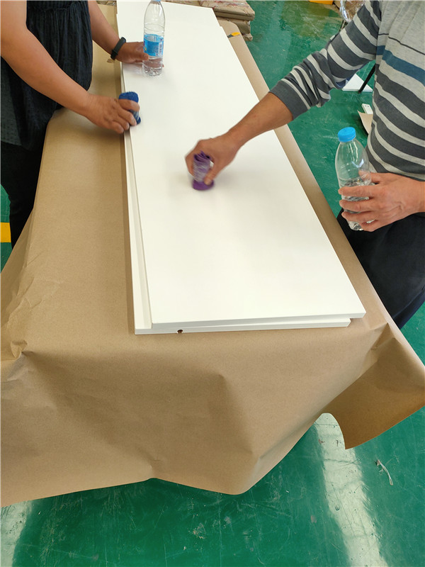 封邊完畢,已進(jìn)入打包環(huán)節(jié)。柜門師傅會用柏油清洗劑全部擦拭一遍,以保證裝到客戶家整潔美觀。
