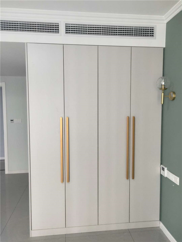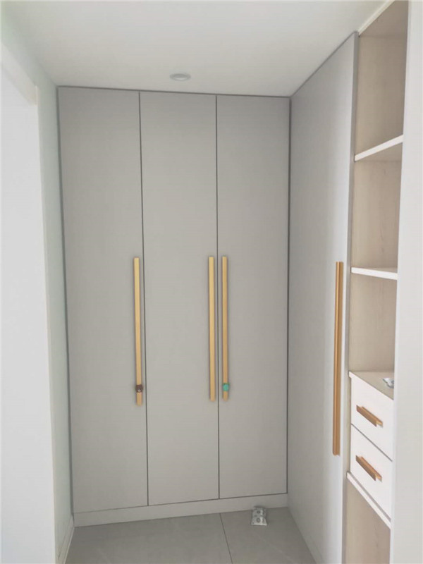 灰色門板配金色拉手這類型的組合較為搶眼,同時為整個房間的風(fēng)格注入一絲別樣的生機,更將現(xiàn)代衣柜原有的大氣以一種活波的形式表現(xiàn)出來了。注:柜體木工現(xiàn)場制作的,柜門定制