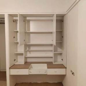 這樣后面封出來的邊更圓滑,全自動機器開料尺寸更精準。插槽背板離墻面1.7公分,防止使用時間常出現(xiàn)柜體發(fā)霉的現(xiàn)象。