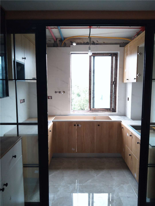 柜子基本拼裝好固定起來了,鞋柜連著卡座,既美觀又實用。業(yè)主家廚房采光挺好的,