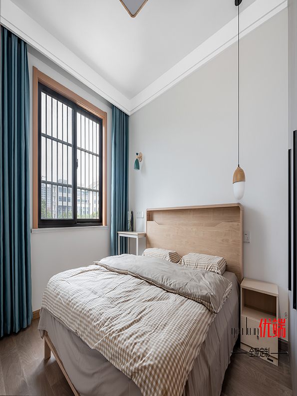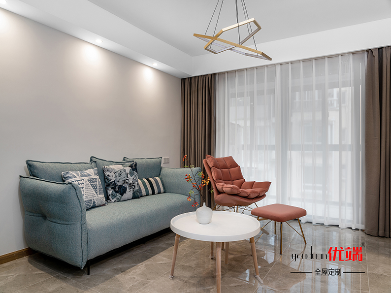 吊柜設(shè)計了一個藍色套盒,起到畫龍點睛的作用。衣柜柜體掛衣區(qū)折疊區(qū)劃分清晰,儲存空間足足的。