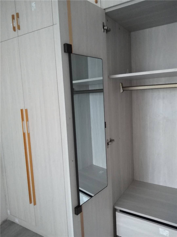 后面在也不用再擔心東西沒地方放了,餐邊柜櫥柜加了灰波玻璃門,滿滿的高級感。小房間的衣柜就比較有特色了,
